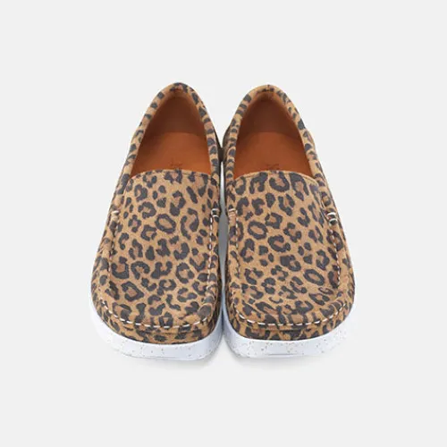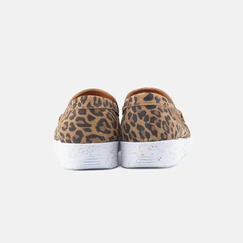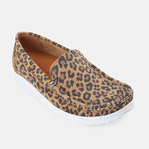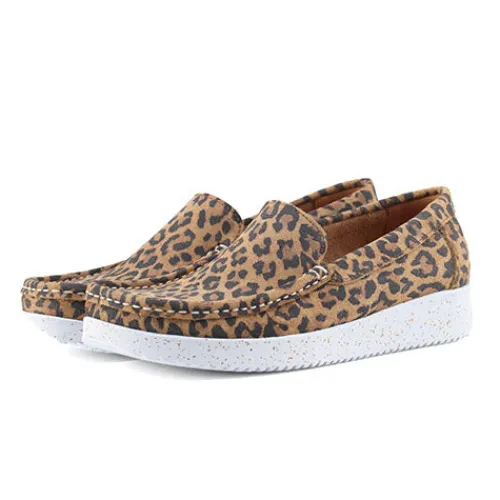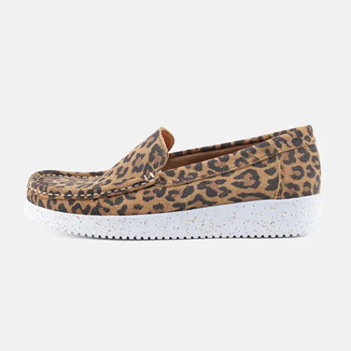 Lækker Elin loafer fra Nature med leopardprint. Skoen er blød, fleksibel og komfortabel og har mokkasinsyning på forfoden. Overdelen er af ruskind, og sålen består af ergonomisk naturgummi med korkrester. Her får du et par loafers perfekt til både hverdag og fest.