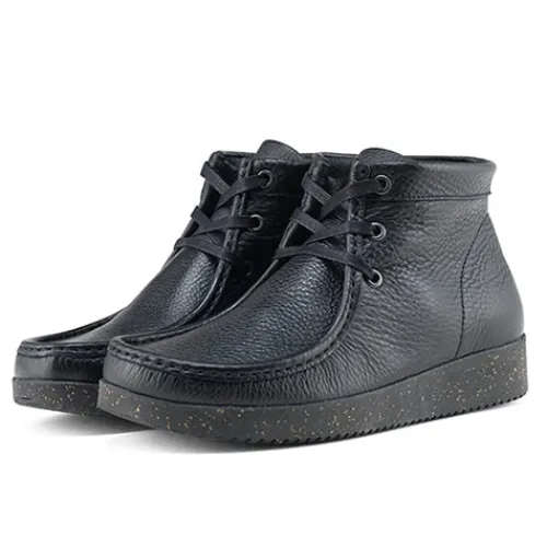 Komfortabel og fleksibel Emma ankelstøvle fra Nature. Overdelen er af blødt “milled” skind og har en håndsyet mokkasinsyning på forfoden. Støvlen justeres og lukkes med bomuldssnørebånd. Foringen på pløsen og indersålen er af OnSteam®, som er Nature Footwears mikrofibermateriale, der både føles som og har de samme egenskaber som læder, men er lettere, blødere og mere fleksibelt. Indersålen er blød og komfortabel, og den stødabsorberende ydersål er af ergonomisk naturgummi med korkrester, hvilket giver et karakteristisk udtryk samt gør støvlen fleksibel og komfortabel med et godt fodfæste. Designet i Danmark, produceret i Portugal.