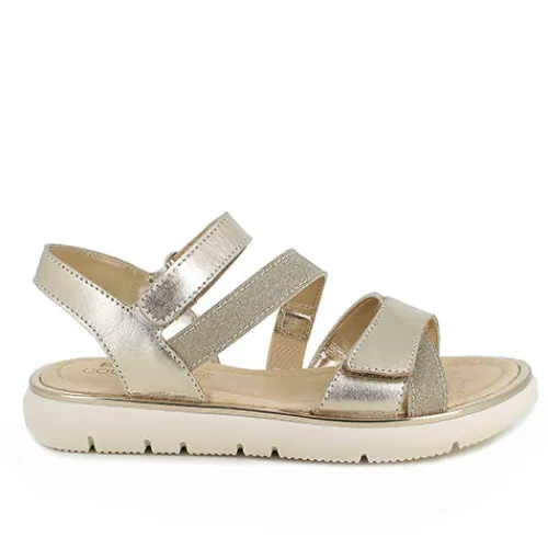 Superflot og let sandal med en overdel af glat skind og syntet. Sandalen lukkes med to velcroremme (forfod og ankel), imens en rem med elastisk fæstning og guldglimmer er med til at holde foden godt på plads. Den åndbare indersål er beklædt med kromfrit skind, og en smart, fast guldkant giver et ekstra flot look. Gummiydersålen er stærk og stødabsorberende med et godt fodfæste.