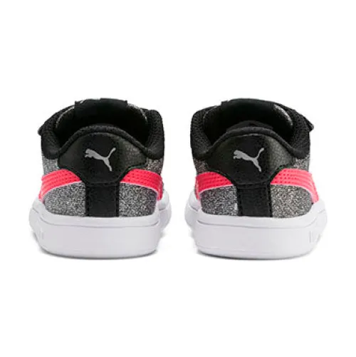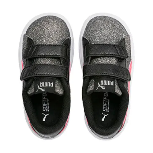Fin glimmer sneakers fra Puma med koralfarvet stribe.. To velcroremme og SoftFoam i sålen.