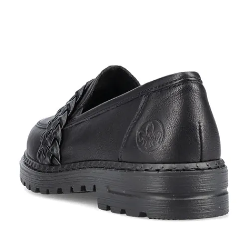 Pæn loafer fra Rieker med flettet rem over vristen. Lidt grove såler under bunden.