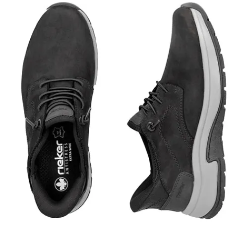 Lækker Ready2GO sko med en overdel af nubuck, og pløsen er af elastisk tekstil. Skoen er designet med den smarte Hands Free Ready2Go-teknologi, der gør det nemt at tage skoen på uden brug af hænder takket være den faste, polstrede hælkappe og elastiske snøring. Den elastiske snøring er ikkejusterbar, men sørger for tilpasning til foden i løbet af dagen. Med vidde H er der ekstra plads om forfoden, og Rieker Antistress-teknologi gør skoen let, fleksibel og affjedrende, hvilket sikrer god støtte og komfort hele dagen. Den udtagelige indersål er polstret og komfortabel, og ydersålen er stødabsorberende med et godt fodfæste.