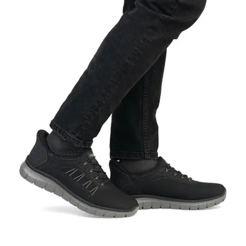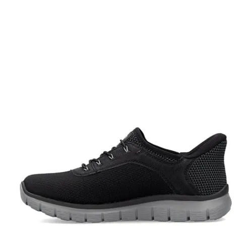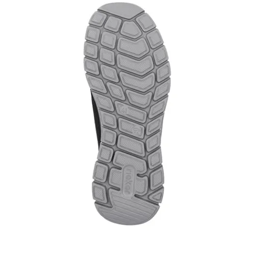 Lækker og meget let sko med Ready2GO, som er Riekers bud på en sko med fast hælkappe, så du nemt kan træde i skoen uden at bukke dig eller bruge dine hænder. Skoen er således en slip-on-model, og med en ikkejusterbar elastiksnøre tilpasser skoen sig til foden i løbet af dagen. Overdelen er af åndbart tekstil med detaljer af syntet i læderlook, og indvendig er skoen udstyret med et åndbart tekstilfoer. Med komfortvidde er der lidt mere plads om forfoden. Den bløde Antistress-indersål sikrer dig komfort hele dagen, imens den fleksible, stødabsorberende ydersål giver et fint fodfæste.