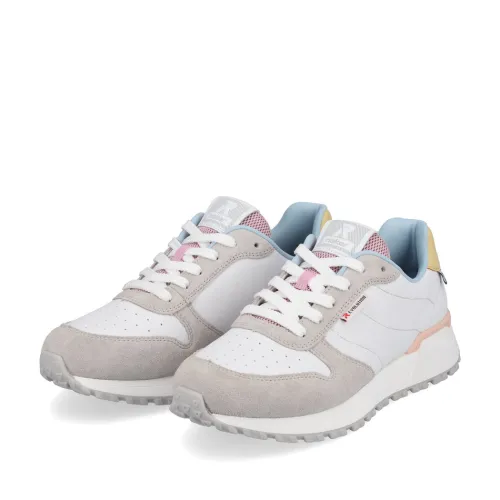Lækker sneaker fra Rieker med snørebånd. Skoen er blød og komfortabel med en polstret indersål, som kan tages ud, samt en polstret åbning. Har smarte og farverige detaljer, bl.a. et lyseblåt foer, en lyserød pløs og en gul detalje med R på hælen.