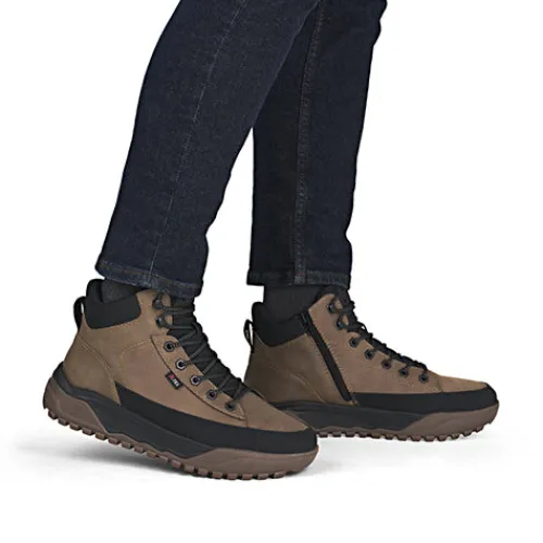 Kraftigt vandafvisende vinterstøvle med Rieker-TEX og en overdel af tekstil og syntet. Støvlen justeres med snørebånd og lukkes med en lynlås på indersiden af anklen, åbningen er godt polstret, og en trækfane på hælen gør det nemt at træde i støvlen. Med vidde G er der mere plads om forfoden. Indvendig har støvlen et varmt foer, og sammen med Rieker-TEX-membranen holdes fødderne varme og tørre. Den udtagelige indersål har Thermo-Foil og beskytter dermed ekstra mod kulde nedefra. Indersålen er desuden polstret og komfortabel, og den kraftigt mønstrede gummiydersål er stødabsorberende med et godt vejgreb.
