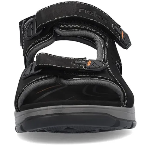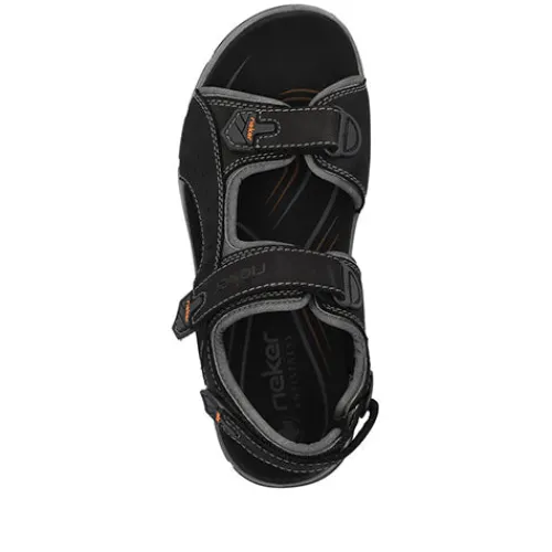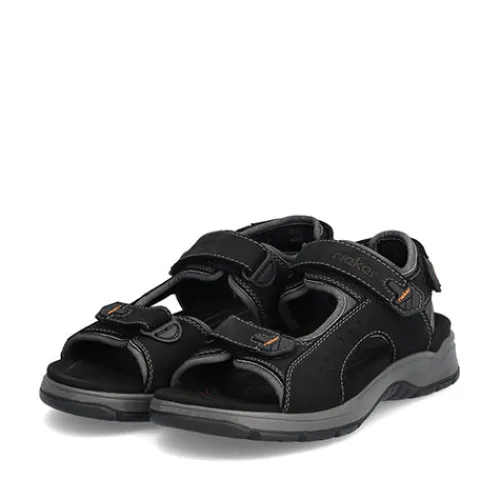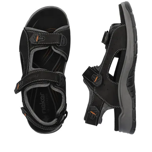 Lækker og sporty sandal med spændende detaljer. Overdelen er af skind og tekstil, og sandalen lukkes med tre velcroremme (forfod, vrist og hæl) for optimal tilpasning. Antistress-dæksålen er komfortabel, og den kraftige ydersål er stødabsorberende og giver et godt fodfæste.