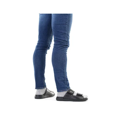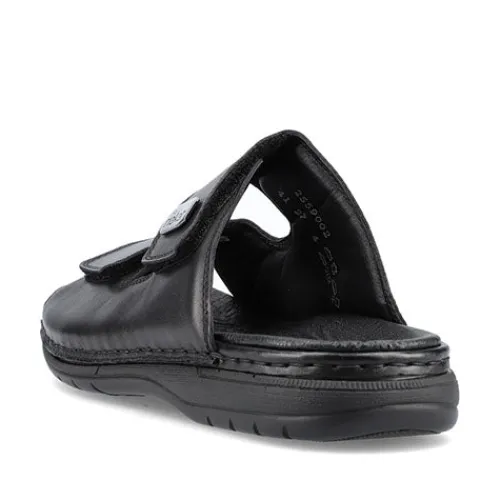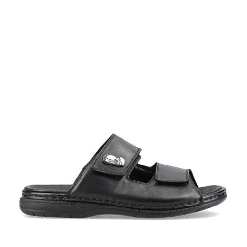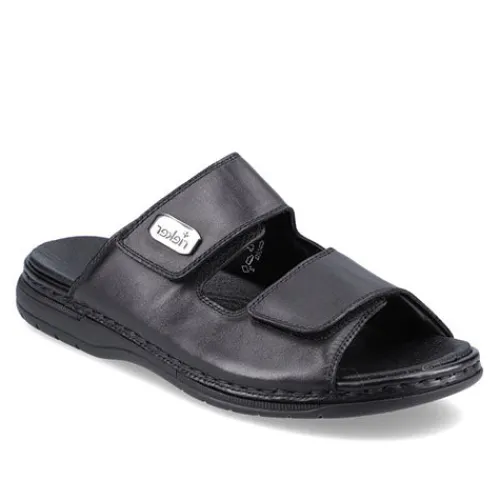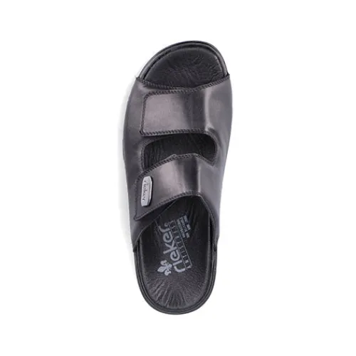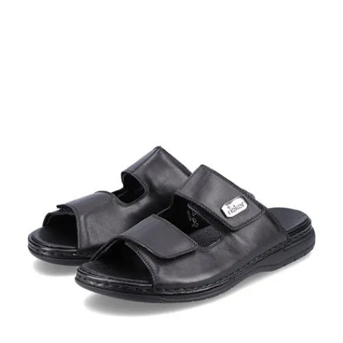 Herresandal fra Rieker i blødt skind. Sandalen har to velcroremme og en blød eftergivende dæksål. Sandalen fra Rieker har god støtte på begge sider, da den lukker til på siden af foden. Fleksible og stødabsoberende såler. Rieker sandalen egner sig også godt som hjemmesko.