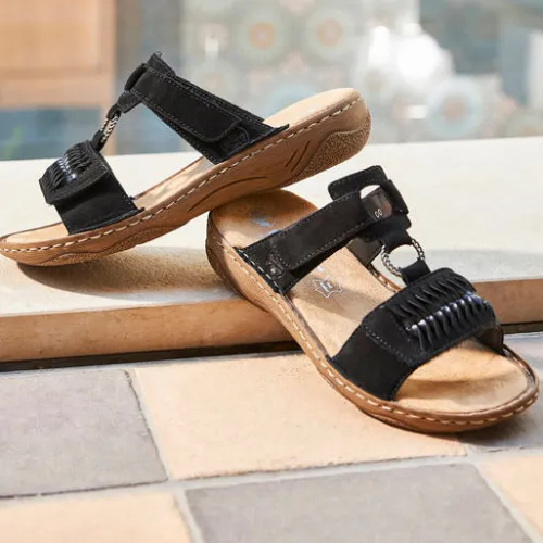 Dejlig og let slip on-sandal med en overdel af nubuck dekoreret med en metalring samt et tvistdesign på forfoden. Sandalen kan tilpasses foden med to velcroremme over forfod og vrist. Antistress-indersålen er komfortabel, og den fleksible ydersål er stødabsorberende med et fint fodfæste samt et diskret løft.