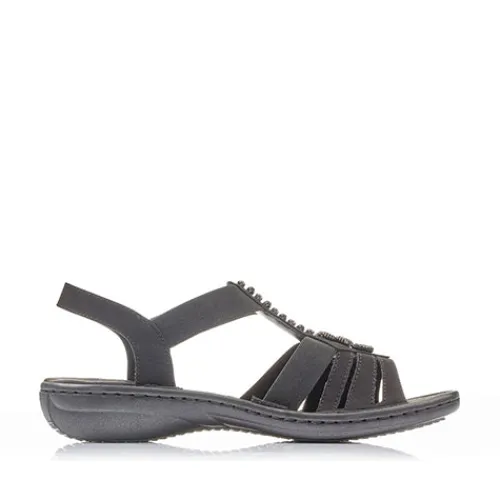 Komfortabel sandal med en overdel af imiteret ruskind og elastikremme, dekoreret med perler udført i et maritimt tema (fisk og skaller) på vristen. Den bløde Antistress-indersål er polstret og komfortabel, og den fleksible ydersål er stødabsorberende med et fint fodfæste. Sandalen har en let forhøjet hæl, som giver et feminint look.