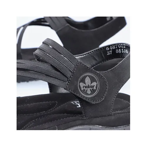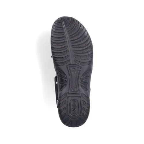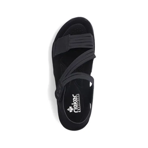 Dejlig let og blød sandal fra Rieker med fine detaljer og en stødabsorberende bund. Sandalen har 2 velcrolukninger (forfod og vrist), som gør det nemt at komme i den. Remmene er elastikbånd, hvilket gør sandalen meget fleksibel og komfortabel. EVA-ydersålerne gør sandalerne lette og fleksible, så du oplever velvære, uanset hvor længe du har dem på.