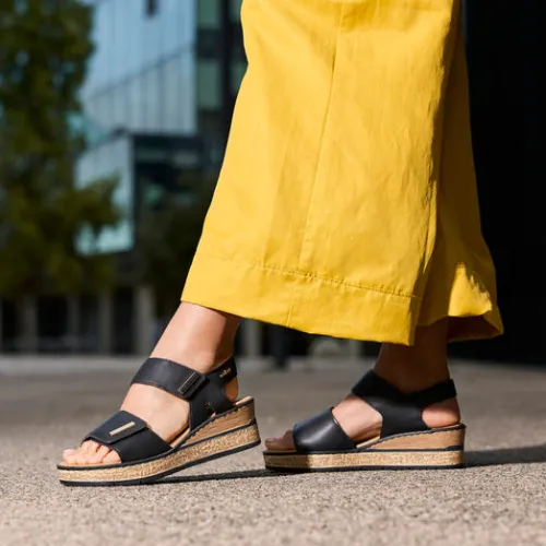Lækker sandal med en overdel af imiteret glat skind. Sandalen lukkes med to brede velcroremme dekoreret med gyldne metaldetaljer, og hælremmen er fæstnet med elastik for øget fleksibilitet samt dekoreret med et gyldent metallogo. Den tekstilbeklædte Antistress-dæksål er komfortabel, og ydersålen er stødabsorberende. Kilehælen på 5,5 cm giver et feminint look, og komforten er i top med en ca. 2,5 cm plateausål under forfoden. Denne model er flot til både hverdag og fest.