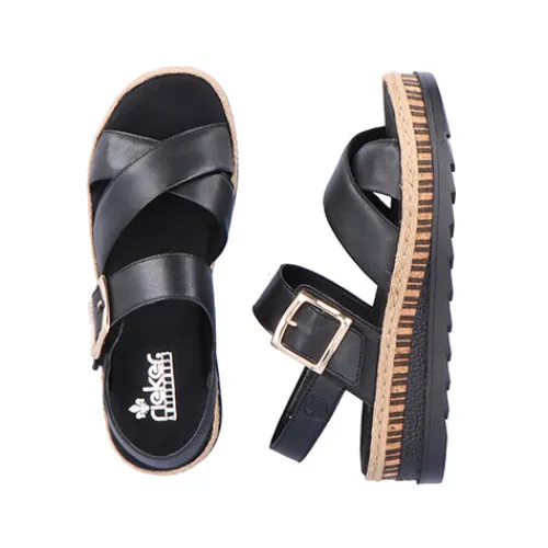 Dejlig sandal med en overdel af glat skind med en klassisk krydsrem over forfoden. Sandalen lukkes med en velcrorem over vristen, og remmen er dekoreret med et firkantet, guldfarvet pyntespænde. Det feminine look understreges af kilehælen dekoreret med kork med striber. Dæksålen er behagelig, og den stødabsorberende ydersål har et fint fodfæste.