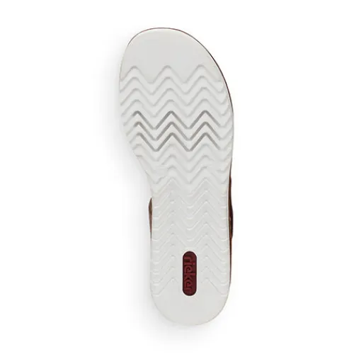 Skøn sandal fra Rieker i flot brun læder. Sandalen lukkes med velcro over forfod og vrist. Dæksålen er beklædt med ruskind. En lille kilehæl i trælook giver et feminint look, og ydersålen giver et fint fodfæste.