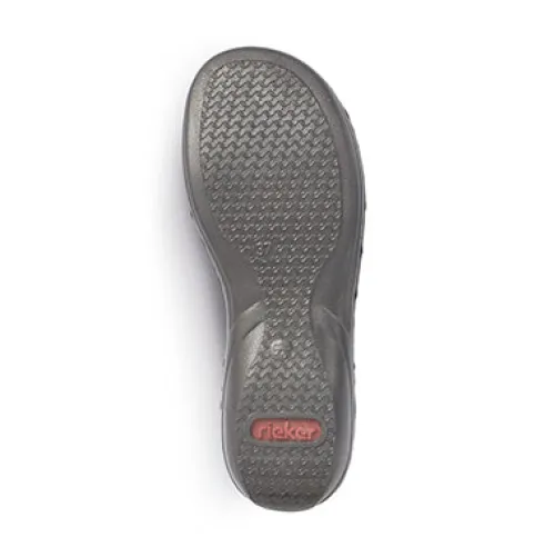 Populær sandal fra Rieker med elastik over vristen og pynt på forfoden. Blød og behagelig dæksål i mikrofiber.