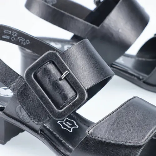 Fin Antistress-sandal med en overdel af glat skind. Sandalen lukkes med to brede velcroremme over forfod og vrist, og sidstnævnte rem er dekoreret med et stort, firkantet spænde. Den 4 cm høje blokhæl giver et ekstrafeminint look, og den fleksible ydersål giver et fint fodfæste.