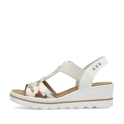 Sommersandal med kilehæl og multifarvede detaljer på vristen. Overdelen er af syntet, dekoreret med udskårne ringe på vristen, og kilehælen giver et feminint look. En elastikrem holder sandalen på plads på foden. Antistress-indersålen giver en fin komfort, og den kraftige ydersål giver et fint fodfæste.