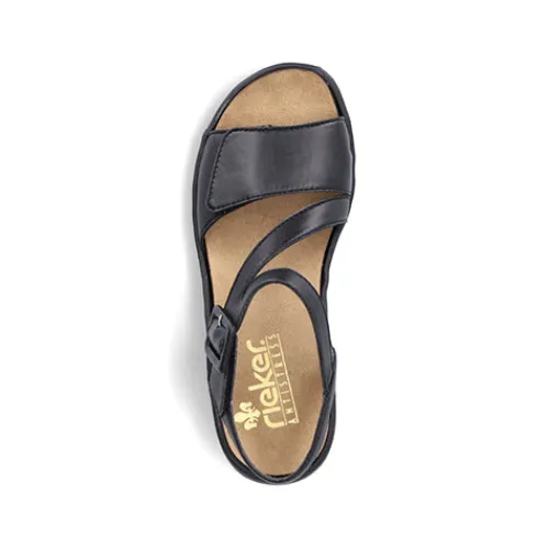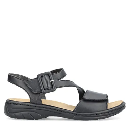 Super fin sandal fra Rieker med pyntespænde. Sandalen har løse indlægssåler og to velcroremme der kan reguleres.