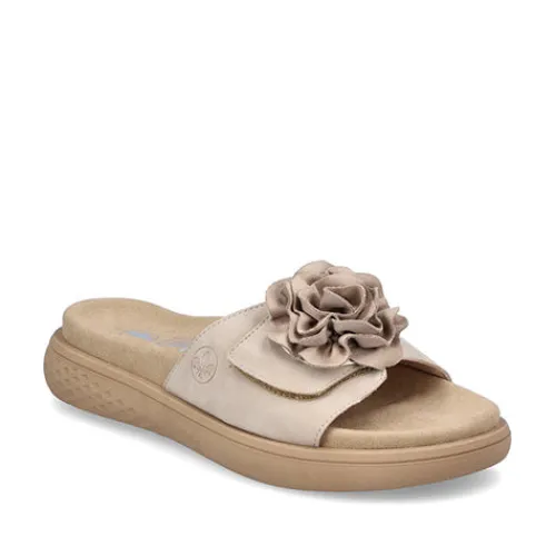 Dejlig og let slippers-sandal med en overdel af imiteret ruskind dekoreret med en blomst på forfoden. Sandalen kan justeres med en bred velcrorem over forfoden. Antistress-indersålen er polstret og komfortabel, og den fleksible gummiydersål er stødabsorberende med et godt fodfæste.