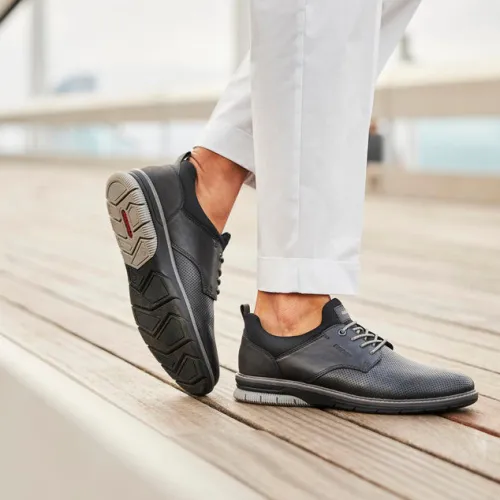 Lækker sko fra Rieker med ikkejusterbare elastiksnører. Overdelen er læder, og indsteppet er blødt, polstret tekstil. Skoen har et klassisk design med flere sporty detaljer, bl.a. er den syede rand brun, og ydersålens hæl er grå. Indersålen, som er af læder, er blød. Skoen er let, fleksibel, rummelig og stødabsorberende.