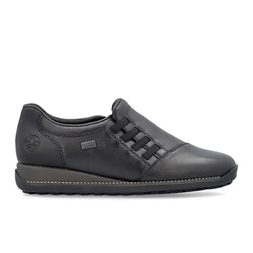 Fin sko med en overdel af glat skind og syntet og elastik i siderne. Skoen er en slip on-model med en smule polstring i insteppet, og indersålen er komfortabel. Med RiekerTEX er skoen kraftigt vandafvisende. Skoen har en lille kilehæl, og den fleksible gummiydersål er stødabsorberende med et godt fodfæste.