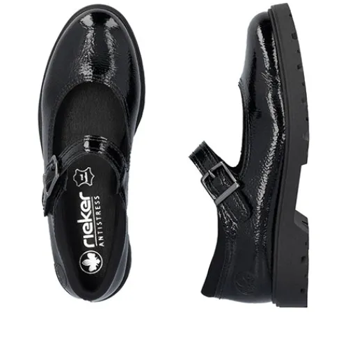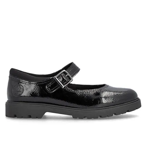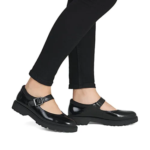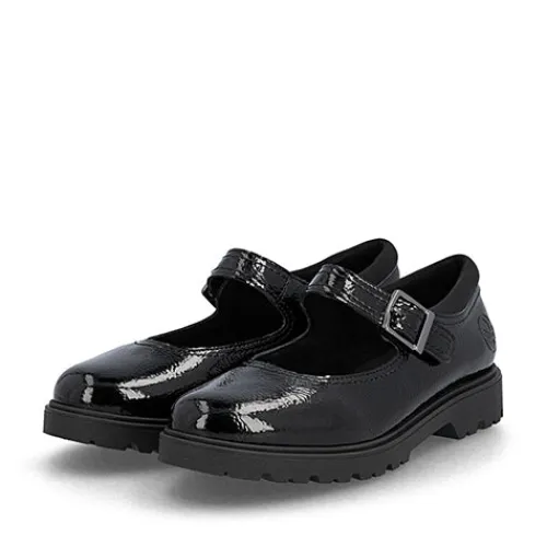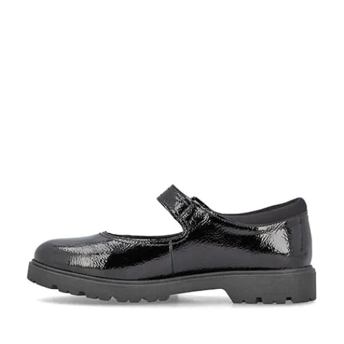 Smart Mary Jane-sko med en overdel af lakeret syntet og en polstret tekstilåbning. Skoen lukkes med en velcrorem med pyntespænde. Den polstrede indersål er beklædt med skind, og den kraftige gummiydersål er stødabsorberende med et godt fodfæste.