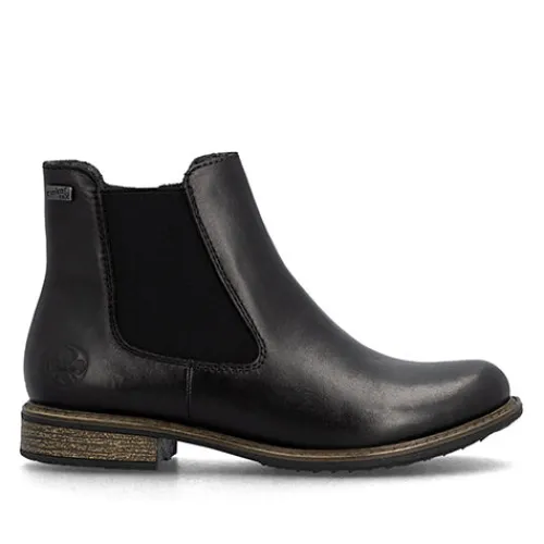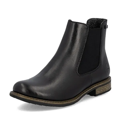 Klassisk ankelstøvle med en overdel af glat skind med et elastikpanel på ydersiden. Støvlen lukkes med en lynlås på indersiden af anklen. Med vidde H er der plads til den bredere fod. Indvendig har støvlen et blødt, let og lunt foer, og sammen med en kraftigt vandafvisende RiekerTex-membran holdes fødderne behagelige og lune. Den udtagelige indersål er polstret, åndbar, støddæmpende og komfortabel, og gummiydersålen er stødabsorberende med et fint fodfæste.