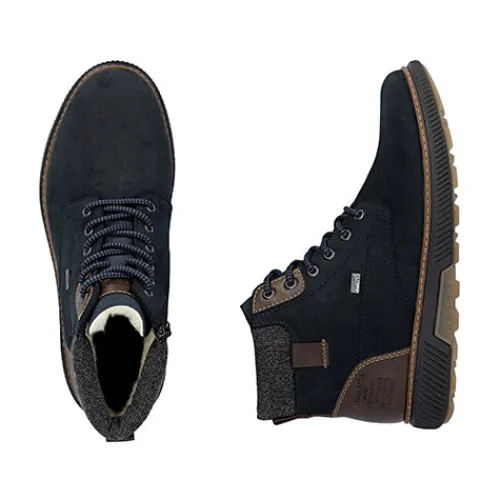 Dejlig ankelstøvle med varmt foer og Rieker-Tex. Overdelen er af nubuck og syntet, og indvendig har støvlen et varmt foer, der sammen med en kraftigt vandafvisende Rieker-Tex-membran sørger for varme og tørre fødder. Støvlen justeres med snørebånd og lukkes med en lynlås på indersiden af anklen. Åbningen er polstret for øget komfort, og med vidde H er der plads til den bredere fod. Den udtagelige indersål er polstret, støddæmpende og komfortabel, og den fleksible gummiydersål er stødabsorberende med et godt fodfæste.