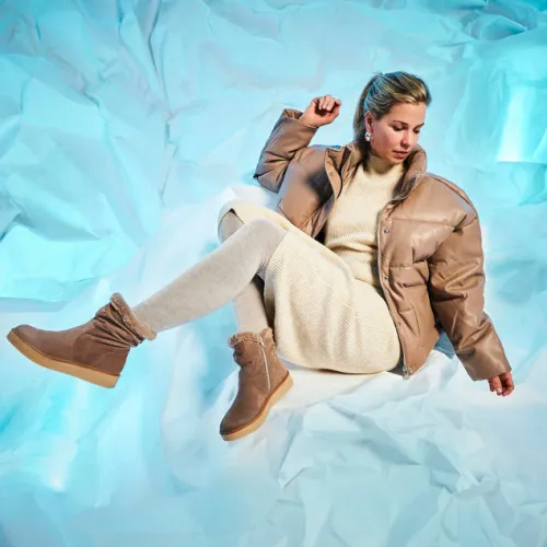 Smart vinterstøvle med en overdel af ruskind, som er rynket over anklen og dekoreret med en faux pelskant om åbningen. Støvlen lukkes med en lynlås på indersiden af anklen. Indvendig har støvlen et varmt foer, og den udtagelige indersål er polstret og komfortabel. Den stødabsorberende gummiydersål med en let kilehæl og plateausål giver et fint vejgreb.