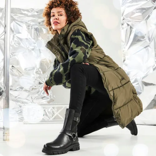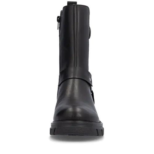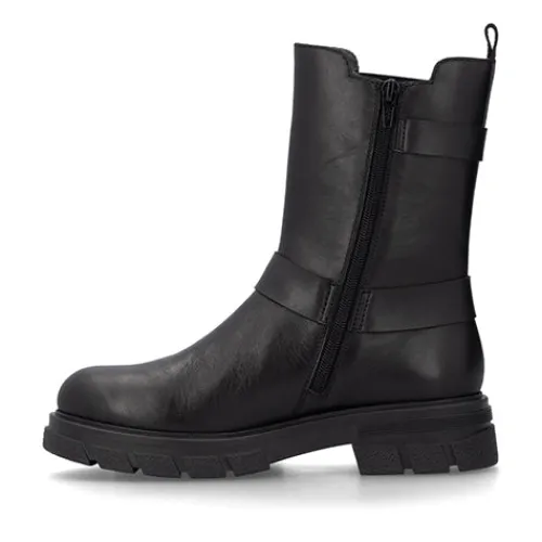 Flot og let støvle i biker-look. Overdelen er af glat skind med et elastikpanel på ydersiden, og støvlen er dekoreret med en ankelrem med O-ring samt en rem med pyntespænde foroven. Støvlen lukkes med en lynlås på indersiden af anklen, og en trækfane bagpå gør det nemmere at træde i støvlen. Indvendig har støvlen et let fleecefoer, og med komfortvidde er der ekstra plads om forfoden. Den chunky gummiydersål er stødabsorberende med et godt vejgreb.