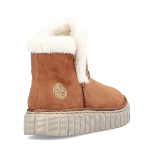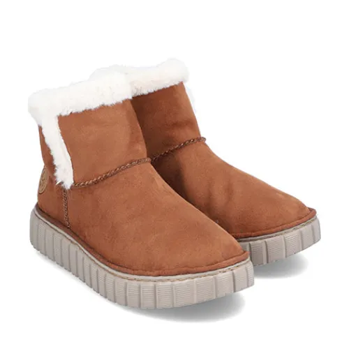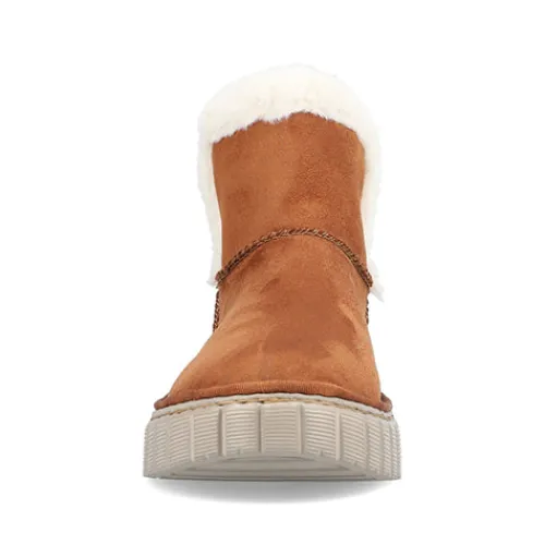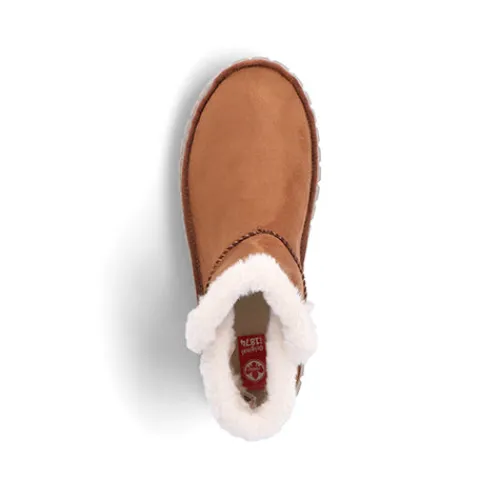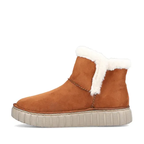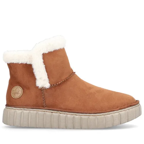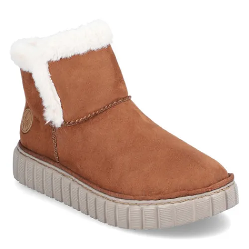 Lækker og meget let Rieker Lite ankelstøvle med en overdel af tekstil i ruskindslook og en åbning kantet med hvid faux pels. Støvlen er en slip-on-model med god plads til forfoden og tæerne, og et varmt foer holder dine fødder lune. Indersålen er komfortabel, og den fleksible og kraftige ydersål er stødabsorberende.