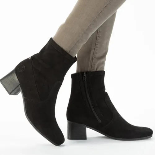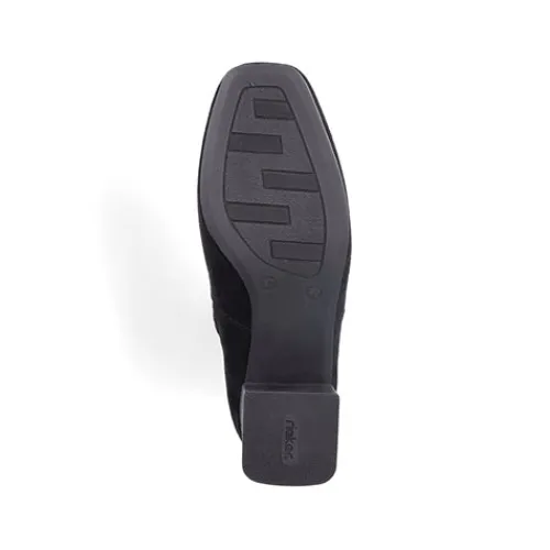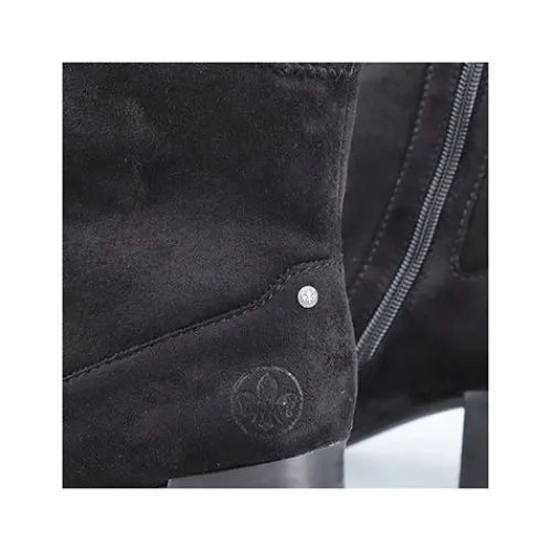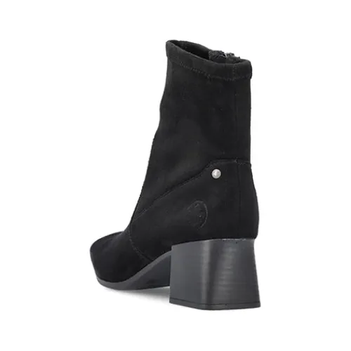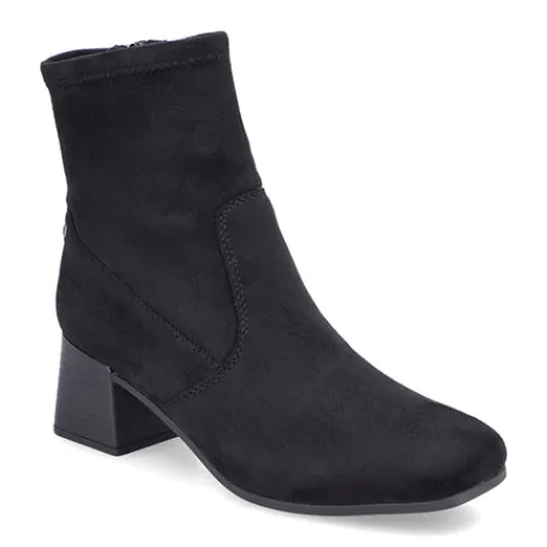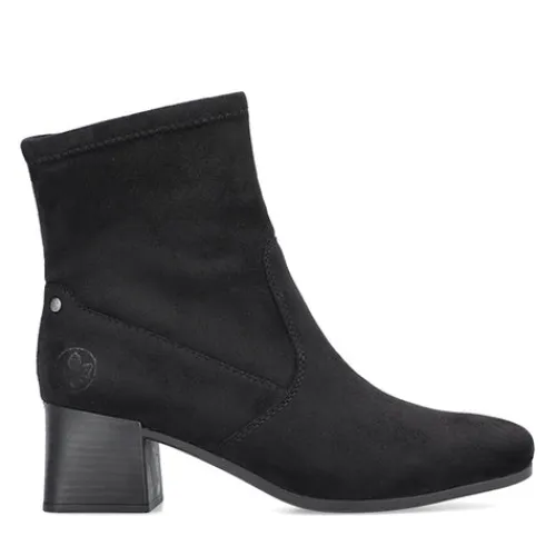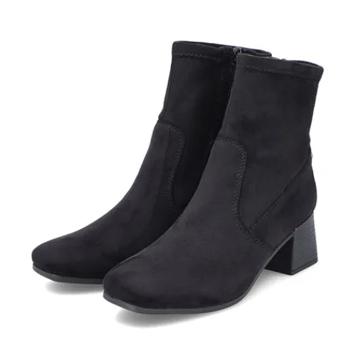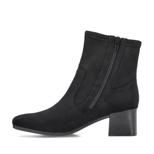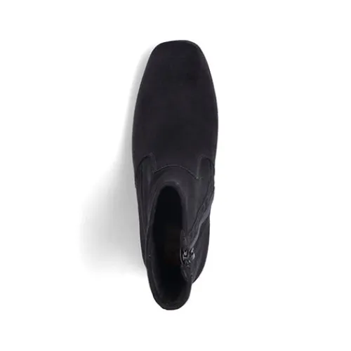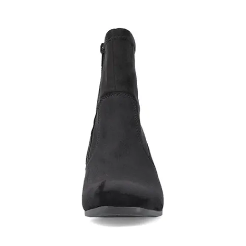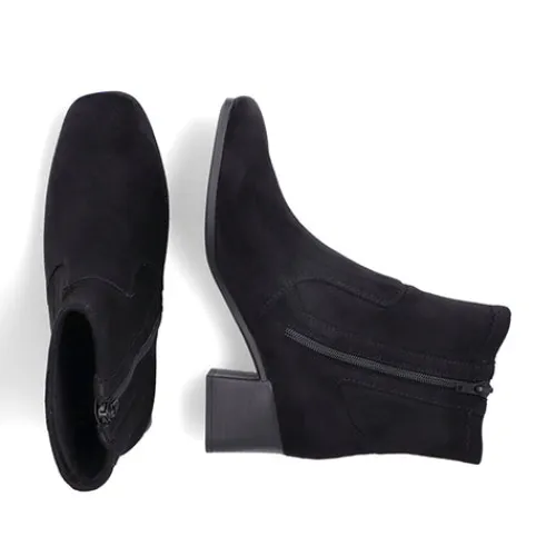 Stilren og let ankelstøvle med 5,5 cm hæl. Overdelen er af tekstil, og på hælen sidder et lille metalemblem med Rieker-logoet. Støvlen lukkes med lynlås på siden. Indersålen er komfortabel, og ydersålen er fleksibel. Støvlen er stødabsorberende og ekstra rummelig om forfoden.
