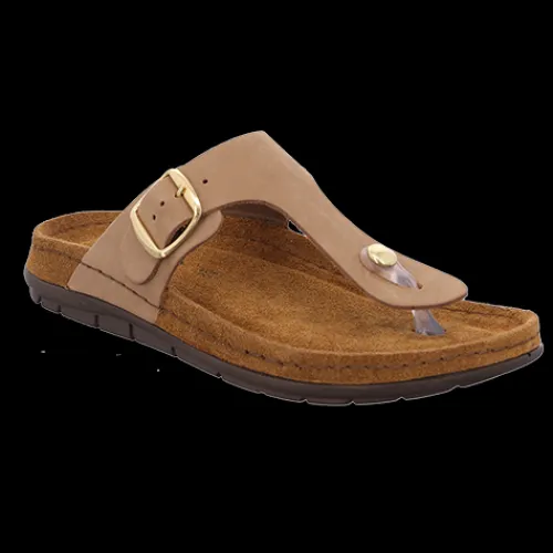 Lækker slippers-sandal med tåstrop. Overdelen er af blød og robust nubuck dekoreret med en guldfarvet rund nitte på tåstroppen. Sandalen kan reguleres med et spænde på ydersiden af foden, og med bredde G får du en behagelig vidde og pasform. Den komfortable Memory-dæksål med let memory-gel fordeler vægttrykket, dæmper og aflaster foden og understøtter fodens naturlige bevægelse. Dæksålen er beklædt med åndbart, robust og svedbestandigt ruskind. Den fleksible ydersål er stødabsorberende med et godt fodfæste og efterlader ikke mærker på gulvet.