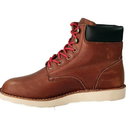 Fed støvle fra Rugged Gear med hvide såler og varmt for. Ekstra brune/gule snørebånd medfølger. Lille i modellen.