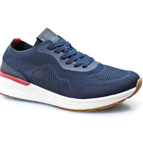 Fin blå herresko fra Rugged Gear med røde detaljer bagpå. Skoen har huller i overdelen så de fremstår luftige og åndbare.