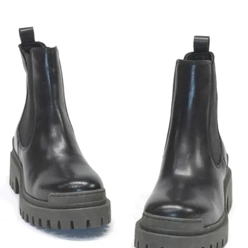 Smart og rå støvle fra ShoeDesign med en chunky sål i army grøn farve. Støvlen har elastik på begge sider af skaftet og er derfor nemme at trække på.