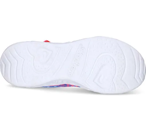 Overdel med leopardprintet mesh tekstil glitrende finish på tå hæl og velcrolukning og med elastikbånd. On/Off knap til lyset på velcrolukningen.Skechers S-Lights Heart Lights – Love Match er en super sød sko med lysende hjerter i sålen. Overdelen er af farverigt leopardprint. I sålen er der udskårne hjerter, som lyser i forskellige farver når man går. Skoen er nem at tage på med