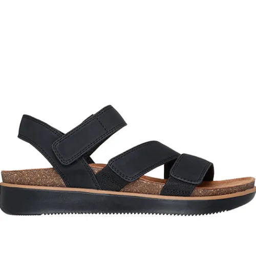 Dejlig Lifted Comfort sandal med en overdel af imiteret nubuck (duralæder). Sandalen lukkes med tre velcroremme, og med Relaxed Fit er sandalen mere rummelig om forfoden. Den komfortable Skechers Memory Foam-fodseng med korkdetaljer er formstøbt med tågreb, og den fleksible ydersål er stødabsorberende med et fint fodfæste. Fremstillet af 100 % veganske materialer.
