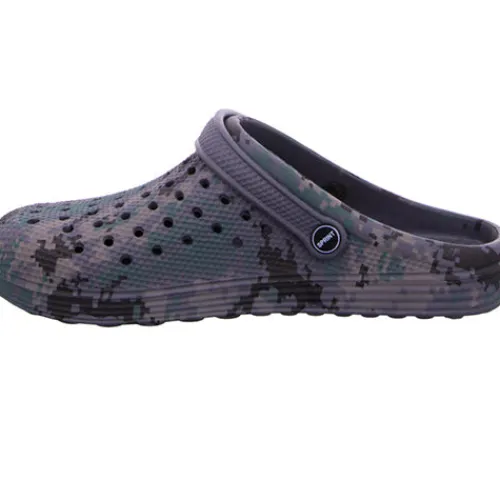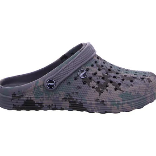 Lækker og utroligt let Sprint slippers-sandal med lukket tå og en PU-overdel med camouflage-look. Over forfoden er overdelen perforeret med lufthuller, så du er sikret en god åndbarhed, og en drejelig hælrem kan haves enten om hælen eller på forfoden. Indersålen er polstret og komfortabel, og den fleksible ydersål giver et fint fodfæste.
