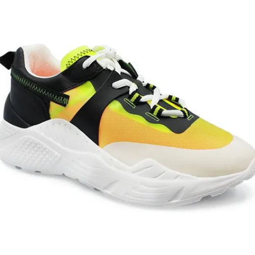 Sporty sneaker fra Steve Madden hvor overdelen bl.a. er i gennemsigtigt mesh, hvor farven bliver påvirket af strømpen man har på. Et fint farvemix hvis man er til gule og orange farver. Skoen er super let, trods de kraftige såler.