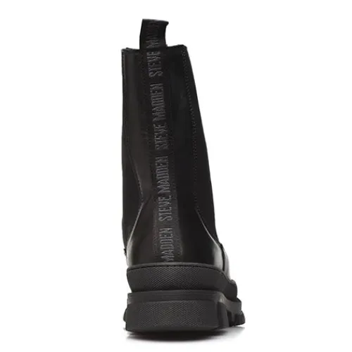 Smart Steve Madden støvle til børn i en lækker skindkvalitet. Støvlen er let, trods det kraftige udtryk på ydersålen. Bagpå støvlen er der påsat strop med logoprint. Modellen er foret med skind/tekstil. Elastik på ydersiden og lynlås på indersiden af skaftet, så den er let at få af og på.