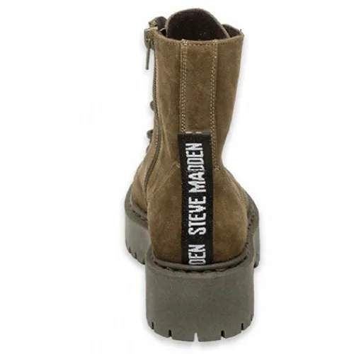 Smart Steve Madden støvle til børn i en lækker ruskindkvalitet. Støvlen er let, trods det kraftige udtryk på ydersålen. Bagpå støvlen er der påsat strop med logoprint. Modellen er foret med skind/tekstil. Snørebånd foran og lynlås på indvendig side af skaftet.