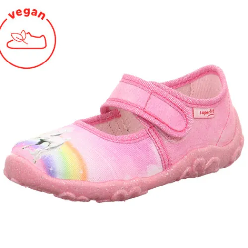 Dejlig Bonny hjemmesko med en overdel af tekstil dekoreret med et print på forfoden af en enhjørning. Skoen lukkes med en velcrorem over vristen. Den fleksible ydersål har lufthuller under forfoden for øget åndbarhed. Er 100 % vegansk.