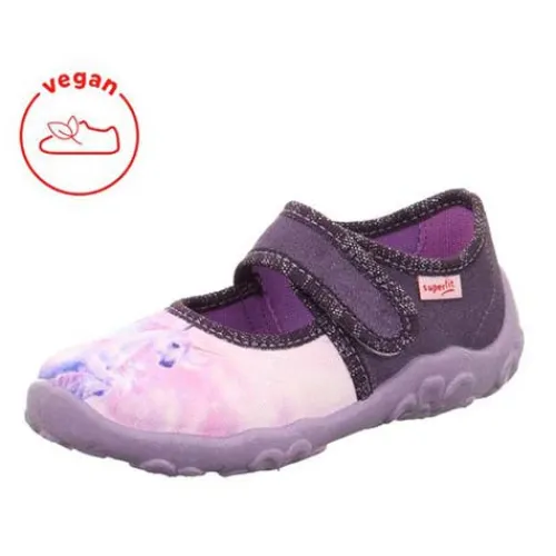 Dejlig Bonny hjemmesko med en overdel af tekstil dekoreret med et print på forfoden af en enhjørning. Skoen lukkes med en velcrorem over vristen. Den fleksible ydersål har lufthuller under forfoden for øget åndbarhed.