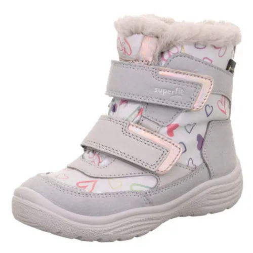 Dejlig Crystal støvle med Gore-Tex og varmt foer. Overdelen er af skind, syntet og tekstil dekoreret med farverige hjerter. Støvlen lukkes med to velcroremme, og åbningen er dekoreret med plys. Indvendigt har støvlen et varmt tekstilfoer, og med en vandtæt og åndbar Gore-Tex-membran holdes fødderne tørre og varme. Den forede indersål kan tages ud, og den stødabsorberende ydersål giver et godt fodfæste.