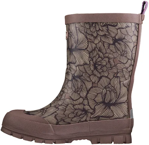 Gummistøvle fra Viking med blomstermotiv og forstærkninger foran. Fremstillet af holdbar naturgummi og har et hurtigttørrende syntetisk foer. En udtagelig indlægssål sørger for polstring og isolering, og sålen med det dybe mønster giver et godt greb på jorden – uden at lave mærker på gulvet. Refleksdetaljer sørger for, at børnene er synlige.
