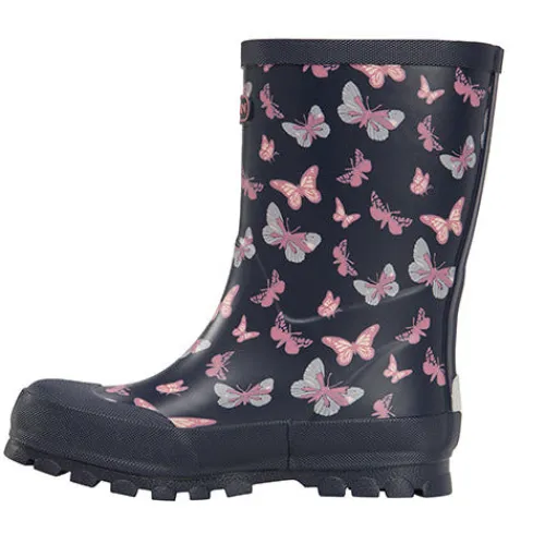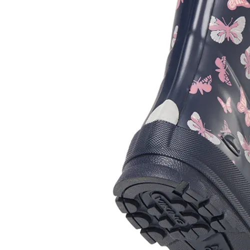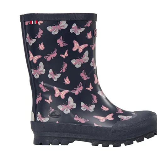 Rigtig fin gummistøvle til piger med rosa sommerfugle og forstærkning på hæl og tå. Gummistøvlen er i blødt naturgummi og har reflekser bagpå.
