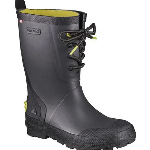 Viking gummistøvle der er fremstillet af holdbar naturgummi og har forstærket snude og hæl samt hurtigttørrende syntetisk for. En udtagelig indlægssål sørger for polstring og isolering, og sålen med det dybe mønster giver et godt greb på jorden – uden at lave mærker på gulvet. Refleksdetaljer sørger for, at børnene er synlige.
