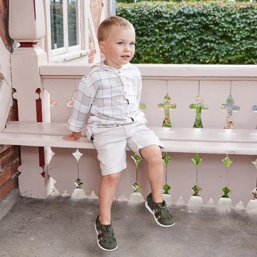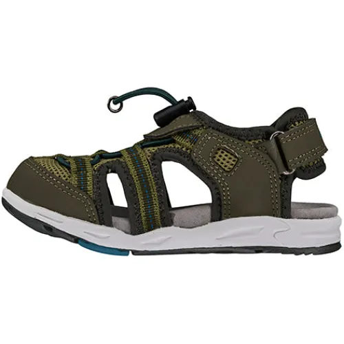 Grøn sandal fra Viking med lukket tå, velcro rem om hælen, samt elastik over foden.
