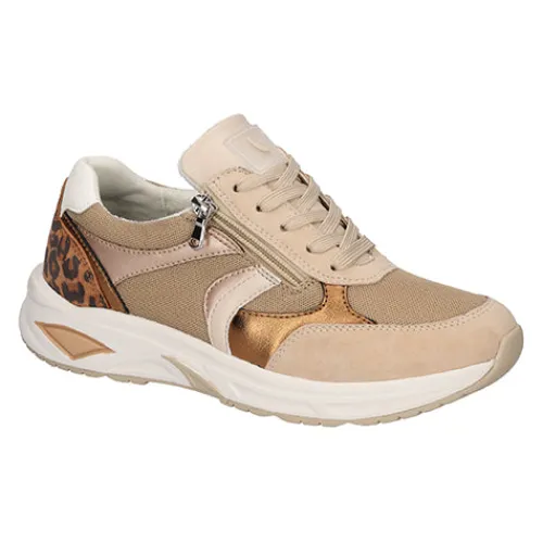 Lækker Velours Mesh Metallic Ast sneaker med en flot overdel af gederuskind, gedenappa (bl.a. med med skinnende effekt) og tekstil. Skoen justeres med snørebånd og lukkes med en lynlås på ydersiden af snørebåndet. Indvendig har skoen et blødt tekstilfoer, og med vidde H er der plads til den bredere fod. Den udtagelige indersål er polstret, støttende og komfortabel, og den robuste ydersål er stødabsorberende med et godt vejgreb. Fås i halve størrelser.