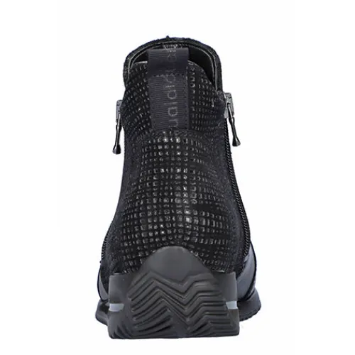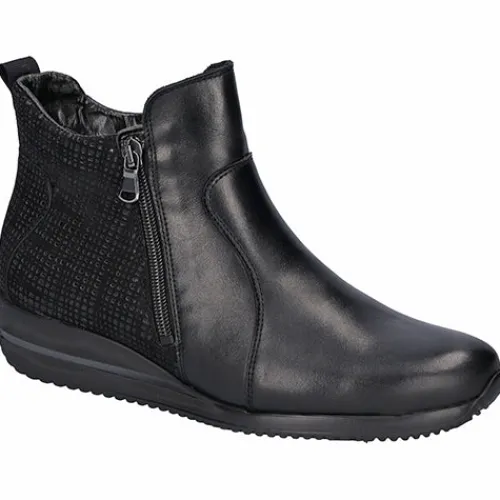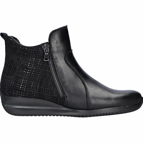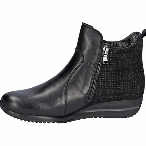 Let og fleksibel Himona ankelstøvle i vidde H med god plads til den bredere fod. Overdelen er af glat skind og præget nubuck med klassiske syninger. Støvlen har to funktionelle lynlåse (en på hver side), så du nemt kan få foden i støvlen, og en trækfane bagpå gør det endnu nemmere at træde i støvlen. Den udtagelige indersål er blød og polstret og giver en fantastisk komfort hele dagen, imens en hælforstærkning yder din fod støtte. Ydersålen er meget fleksibel.